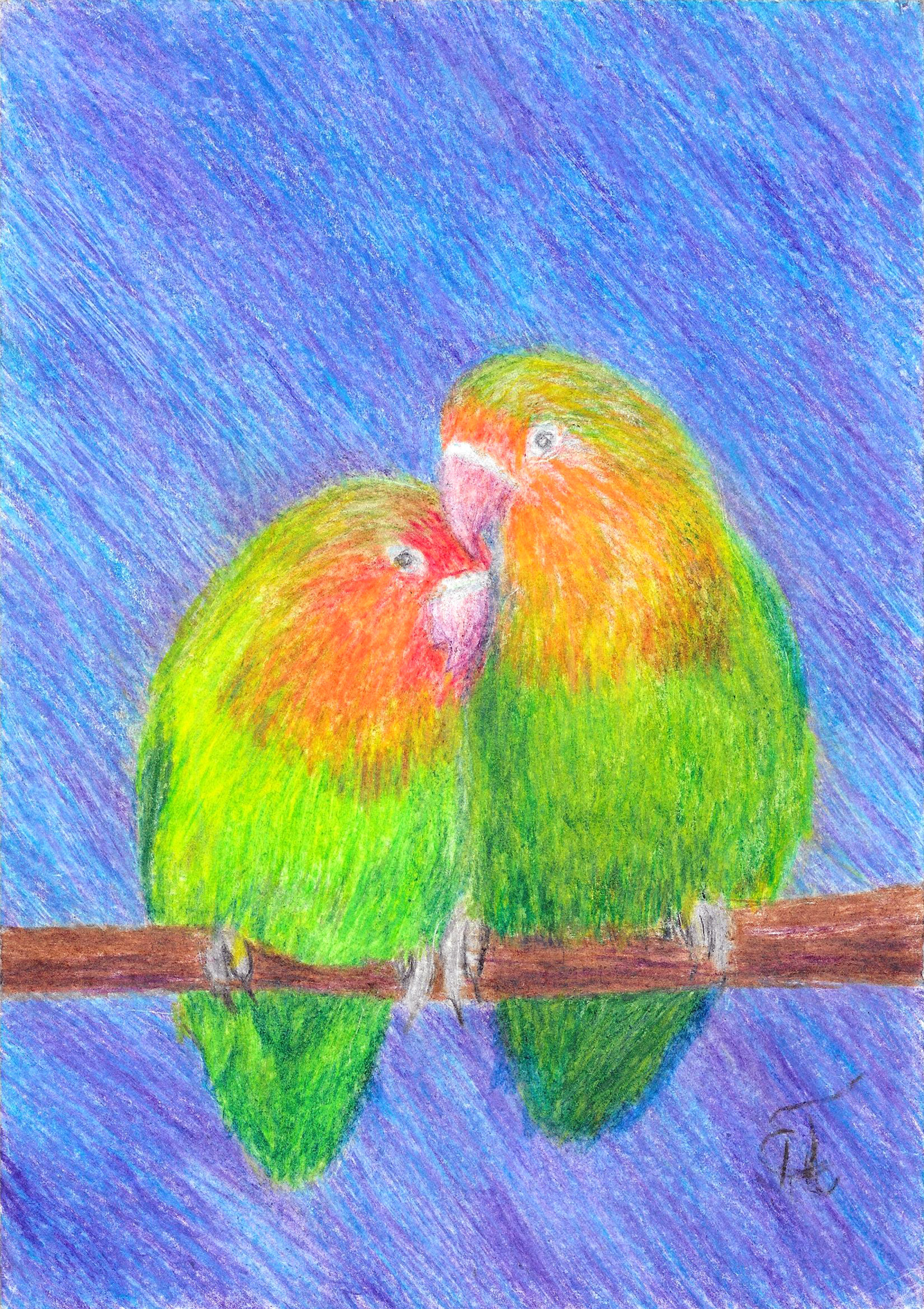 Неразлучники. Нарисовано профессиональными цветными карандашами. Левой ногой.