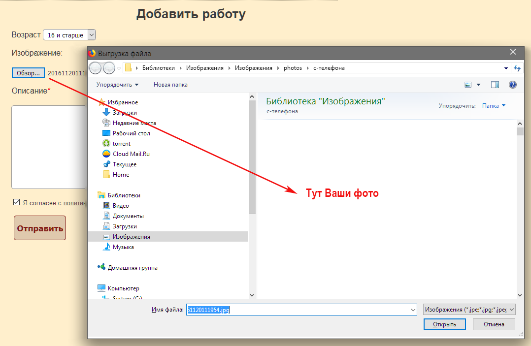 Можно зайти на сайт с помощью смартфона, зарегистрироваться или ввести данные имеющейся учетной записи и затем просто добавлять фотографии непосредственно с него. В этом случае при нажатии кнопки "Добавить работу" откроется галерея фотографий, где нужно будет выбрать нужную и нажать кнопку "Готово" или аналогичную (зависит от модели смартфона).
