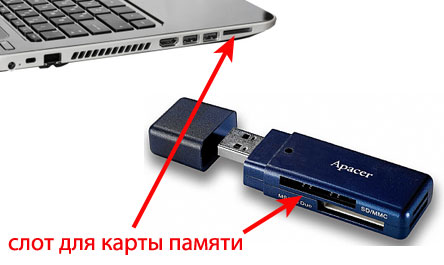 Рис.3. Как выглядит картридер ноутбука и USB-картридер.