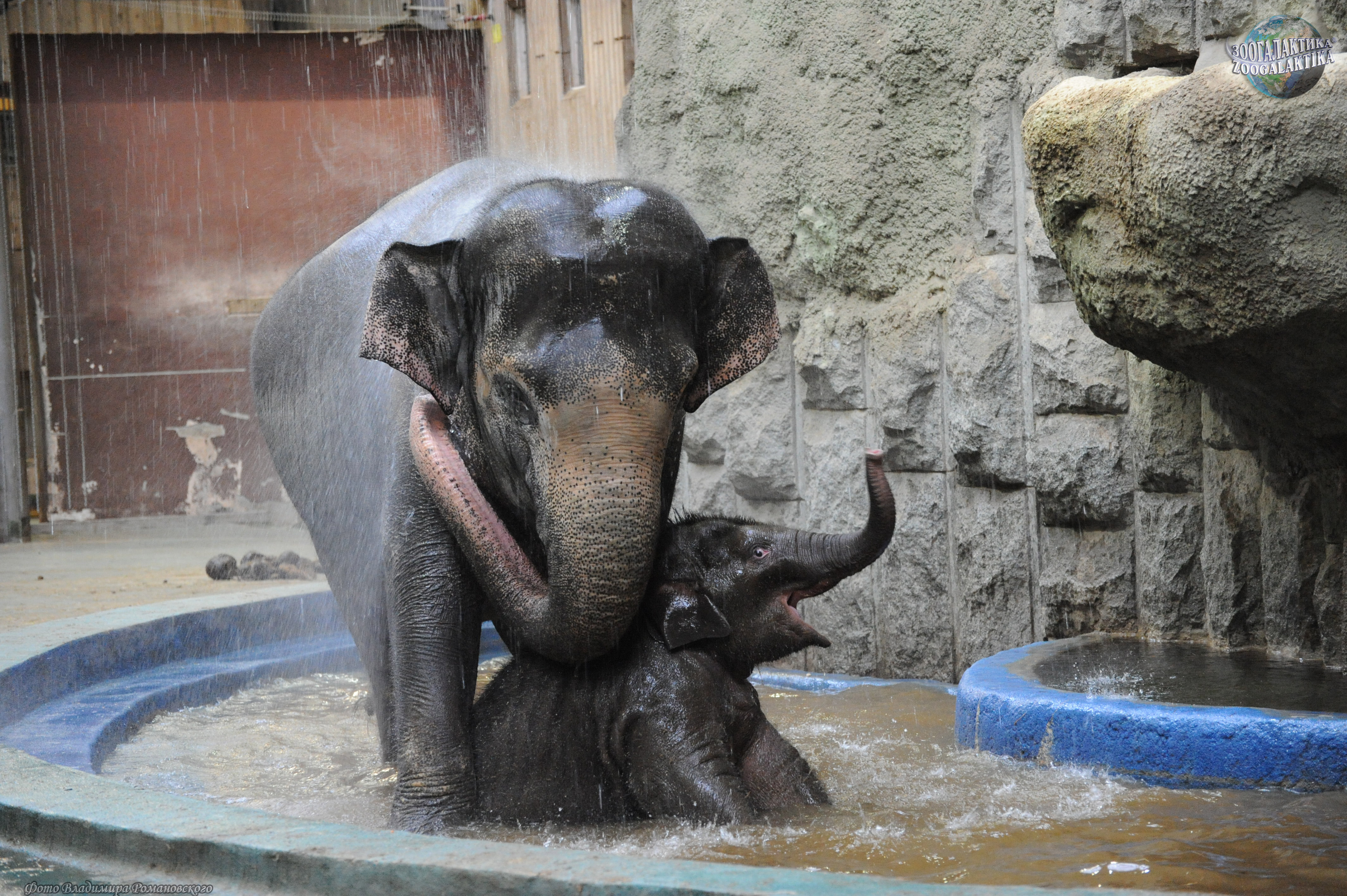 Чтобы как следует поплавать и искупаться, слоны перегораживают мелкие ручьи и речки запрудой. Сваливают в кучу поперек течения камни и землю, строят дамбу — и купальня готова! Если поблизости нет даже маленького ручья, то слоны принимают душ, «черпая» воду из своего неприкосновенного запаса. В носоглотке африканского слона есть особый резервуар, в котором он на всякий случай носит немало литров воды. Это тот самый «водяной бак», который анатомы тщетно искали в желудке у верблюда.