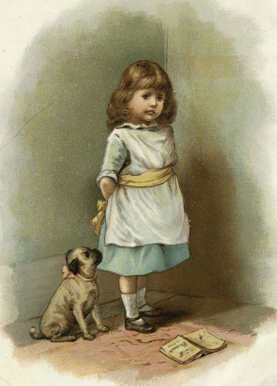Фаня часто играет своими кубиками, в особенности по вечерам, когда в столовой зажигают лампу и ей можно, сидя на своем высоком стульчике, играть на обеденном столе. Бобка тоже усаживается рядом или ложится под столом и, виляя хвостом, ждет, когда Фане принесут ужин; он знает, что девочка и ему уделит кое-что из ужина: кусочек булочки или на блюдечке молока.