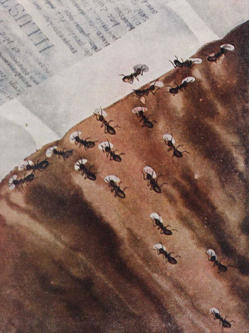 Прошло несколько минут. Рыжие показались снова на поверхности. Каждый держал в челюстях куколку черного муравья.