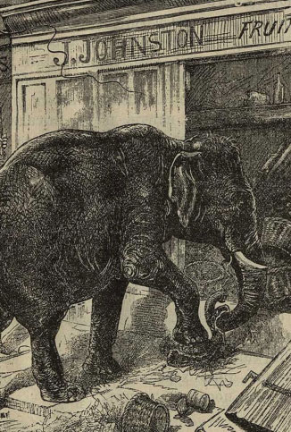 Через несколько лет цирк опять очутился в этом же городке. Молодого слона, как всегда, заперли на ночь, но рано утром, часа в четыре, когда все еще спали, слон ухитрился выйти из своего стойла и отправился «на поиски», по направлению к рынку: дорогу он хорошо запомнил.