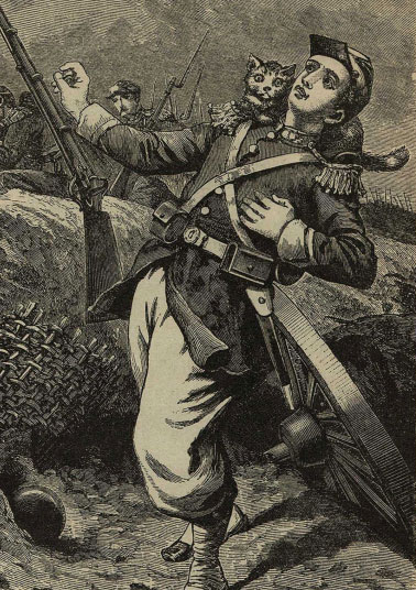 Наконец наступил день большого сражения. Солдат не решился взять с собой своей любимицы и передал ее на попечение больному товарищу; но не прошел он и мили, как кошка догнала его и бежала за ним, жалобно мяукая и требуя, чтоб ее взяли на руки. Солдат поднял животное, и оно мигом вскочило на свое обычное место. – Закипела битва; дым слепил глаза; пули и ядра со свистом пролетали над головой; молодой солдатик был несколько раз ранен и дважды упал, но кошка крепко цеплялась за ранец своими острыми коготками и не двигалась с своего места. Наконец он получил жестокую рану и, обливаясь кровью, упал на землю.