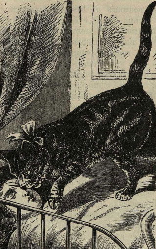 Ребенок не просыпался. Тогда кошка ударила его лапкой по лицу и замяукала над самым ухом. Мальчик открыл глаза, вздохнул и, почувствовав запах гари, – тем временем дым успел уже проникнуть в детскую, – бросился со всех ног по лестнице вниз, а кошка за ним. Таким образом преданное животное спасло мальчика от страшной опасности сгореть заживо.