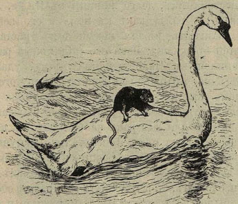 Между прочим многие заметили плывшего по реке лебедя, у которого на спине, среди белоснежных перьев, было маленькое черное пятнышко. Издали нельзя было разобрать, что это за пятнышко, но, когда лебедь подплыл ближе, оказалось, что это живая крыса искала на спине его спасение от бурных волн.