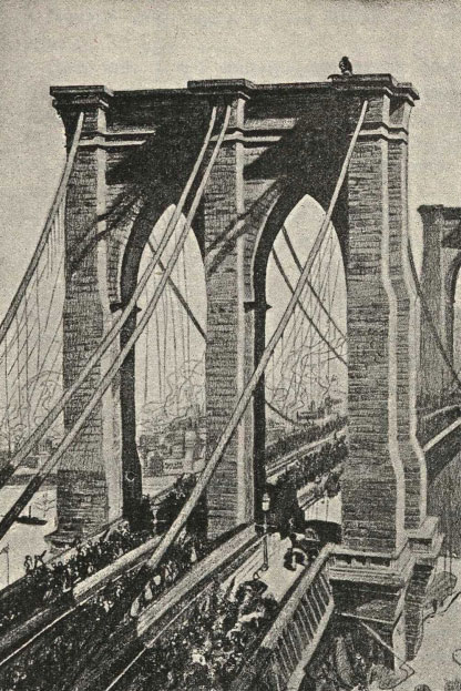 Высоко на парапете одного из громадных устоев, поддерживающих стальные канаты, на которых висит огромный мост, виднелась темная фигурка, державшая в объятиях белую фигурку, еще меньшую ростом.