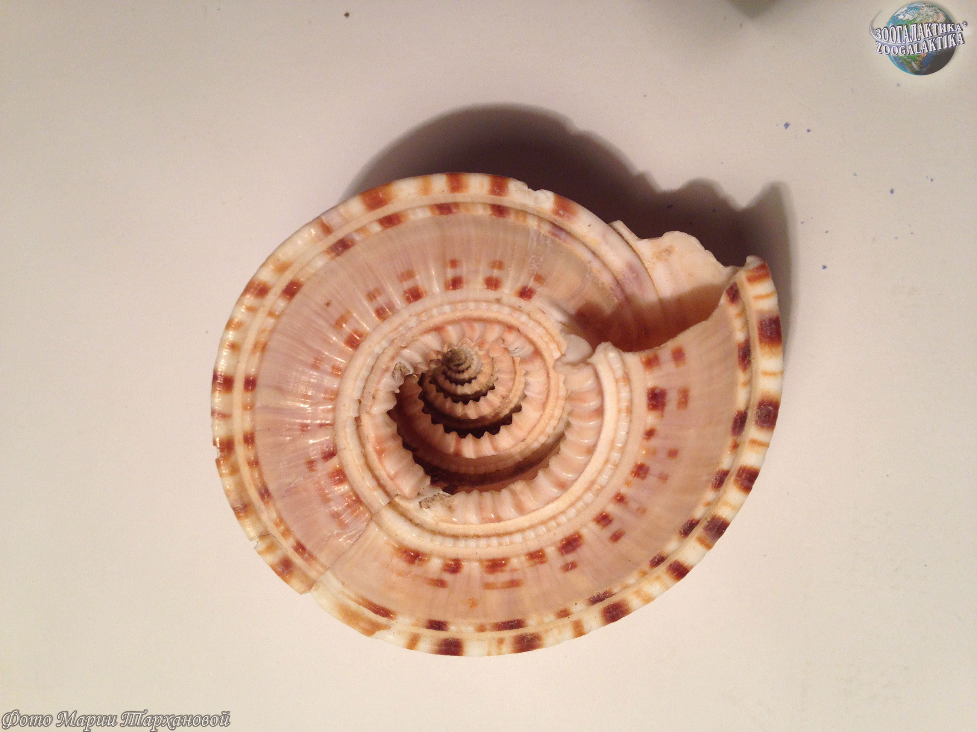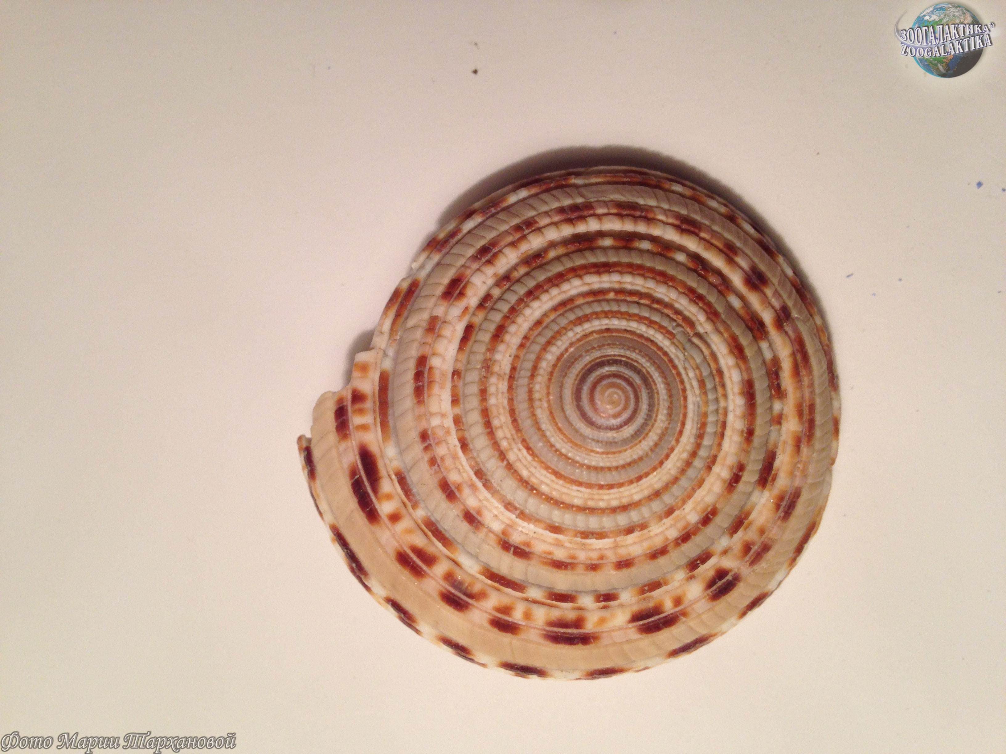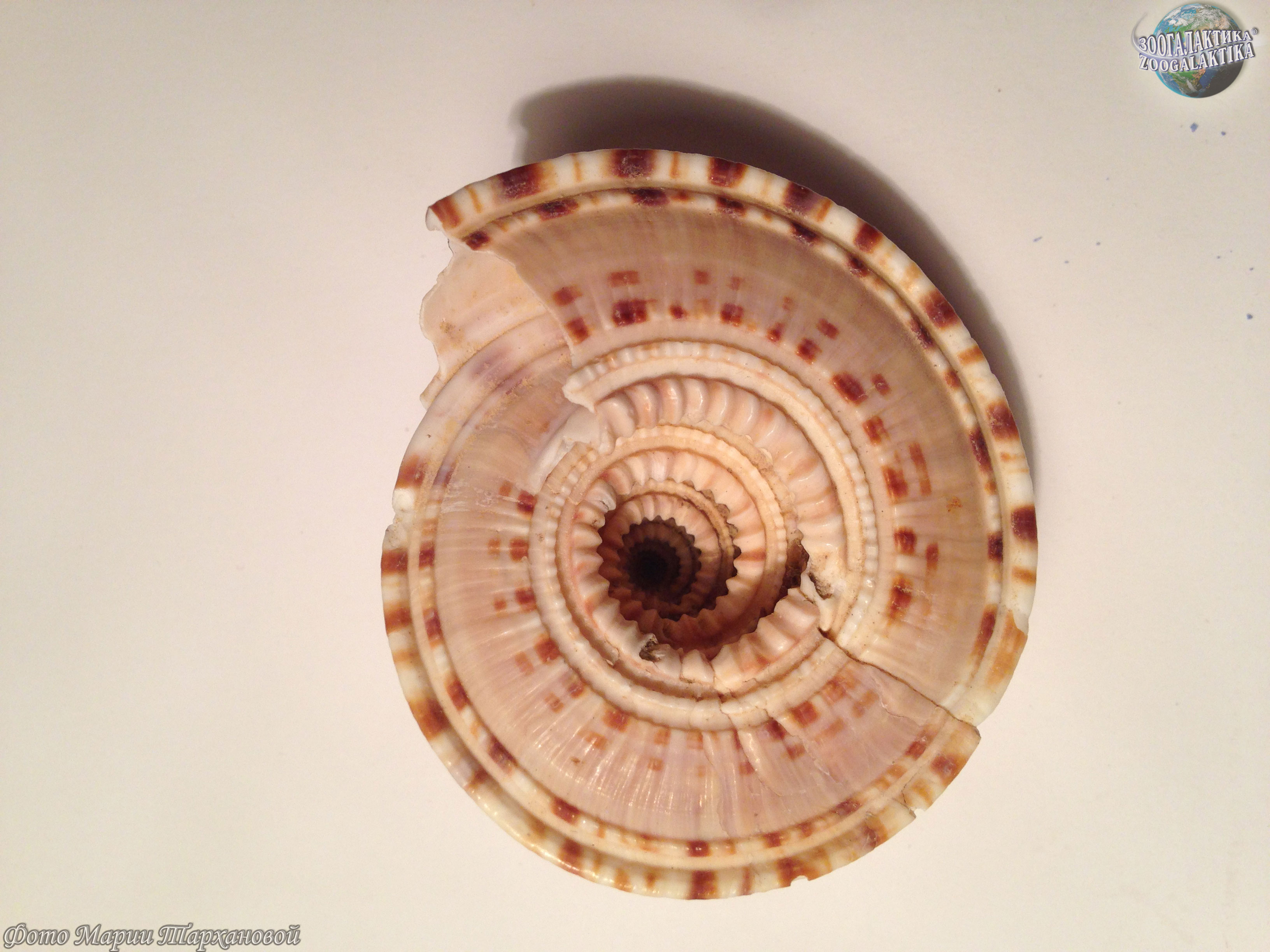 Длина раковины составляет от 5 до 8,5 см. Раковина крупная и крепкая с низким завитком и плоским основанием. Раковина двухслойная: она образует спиральную полость, в которую моллюск для безопасности откладывает свои яйца. На каждом обороте имеется глубокий спиральный желобок ниже шва и одно резко возвышающееся спиральное ребро над ним. По периферии последнего оборота проходят два выпуклых ребра над килем. На каждом обороте располагается большое количество тонких осевых желобков. Пупок широко открытый и глубокий, «перспективный», отсюда и видовое название данного моллюска. На его оборотах также располагаются спиральные желобки и ребра. Общая окраска верхней поверхности раковины светло-коричневая, спиральные ребра – темно-коричневые, желобок между ними бежевого цвета. Основание раковины более светлого оттенка, чем верхняя часть, спиральные ребра на периферии состоят из чередующихся темно-коричневых и белых пятен.