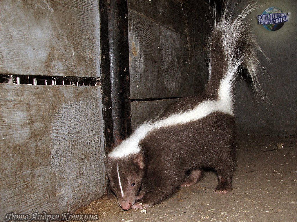 Полосатый скунс (Mephitis mephitis) - зверёк средней величины: длина его тела 28-38 см, хвоста 17-30 см, вес колеблется от 1,2 до 5,3 кг. У него короткие стопоходящие лапы со слабо изогнутыми длинными когтями, приспособленными для рытья, длинный пушистый хвост и короткие уши с широким основанием и закруглёнными верхушками. Мех у скунса очень густой, но грубый, окрашенный в чёрный и белый цвет: на общем тёмном фоне выделяются широкие белые полосы, начинающиеся на голове и идущие вдоль хребта к полосатому черно-белому хвосту (интересно, что детали окраски индивидуальны у каждой особи). Столь яркая и контрастная окраска служит предостережением возможным хищникам.