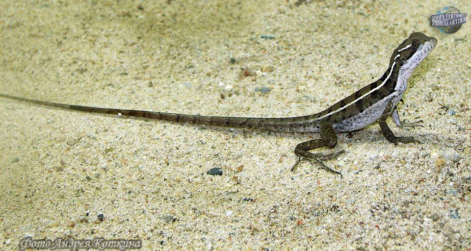 Полосатый василиск (Basiliscus vittatus) - крупная ящерица, длина тела которой достигает 60 см, причем самки немного мельче самцов. Основной окрас полосатого василиска коричневато-бурый или шоколадно-коричневый, горло белое. От заднего края глаза по голове, шеи и бокам тела тянется прерывистая светлая полоса. На затылке у самцов расположен, направленный назад, кожный вырост - "шлем", а по спине и передней части хвоста тянется высокий кожный гребень - "парус", у самок они менее выражены. У этих ящериц большие и сильные задние конечности с длинными пальцами.